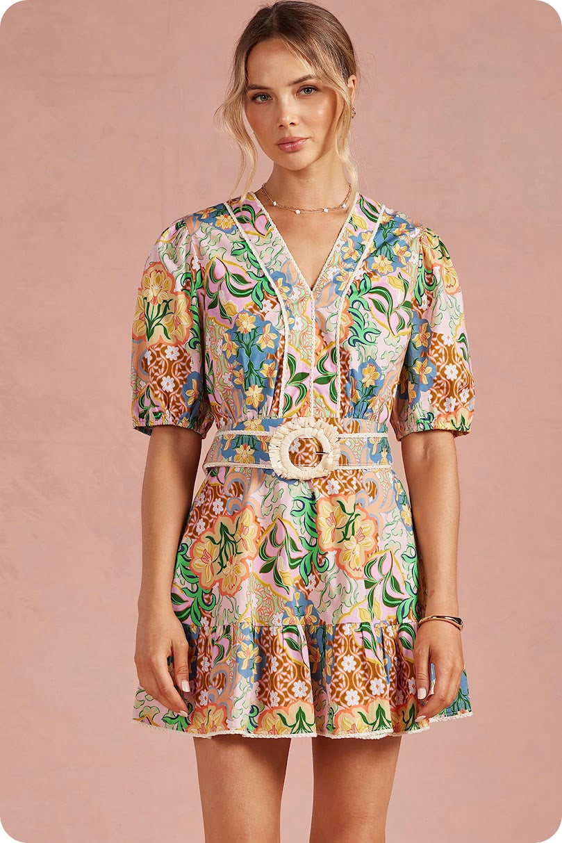 The Gretchen Dress in Multi is your go-to pick for making a joyful impression at any celebration. Bursting with a cheerful floral print, this mini dress brings instant personality to your special occasion lineup. The flattering V-neckline shows just the right amount of style, while short sleeves keep things comfortable and breezy. A gorgeous macrame belt cinches the waist with artisanal flair, and the ruffled hem adds a flirty finishing touch that catches every eye as you move. From graduations and bridal showers to garden luncheons and intimate weddings, this dress adapts beautifully to whatever the occasion calls for. The mix of playful prints and thoughtful details makes it easy to feel fabulous and fun-loving all day long. Pair it with your favorite accessories and watch yourself shine.