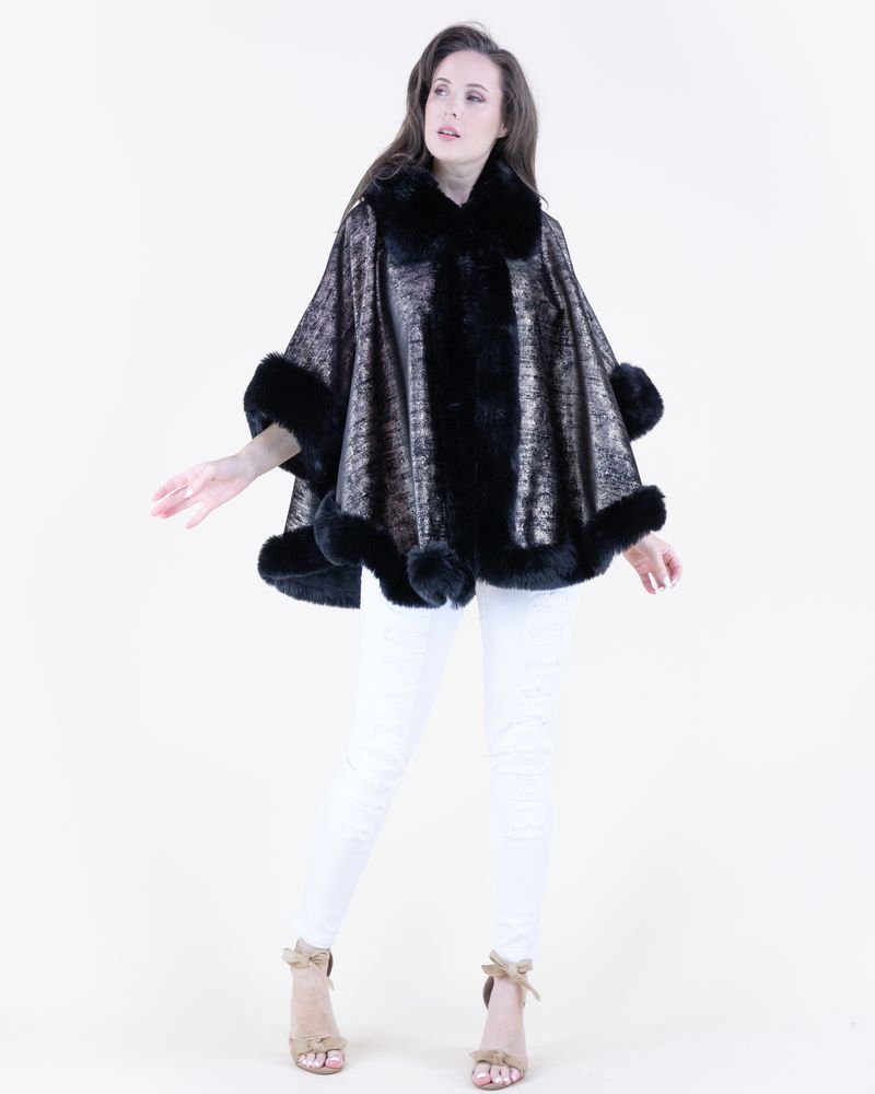 Elevate your style effortlessly with this playful one-size vegan fur trim suede cape in classic black. Its soft, cruelty-free fur edging adds a touch of luxury, while the suede-like fabric keeps it cozy and chic. Perfect for dressing up any outfit, whether you're pairing it with jeans and a cute top for a night out with friends or layering over a little black dress for a stylish event. This versatile cape blends comfort with flair, making it your go-to piece for spirited gatherings and cool-weather fun. Embrace warmth and whimsy in one fabulous accessory!